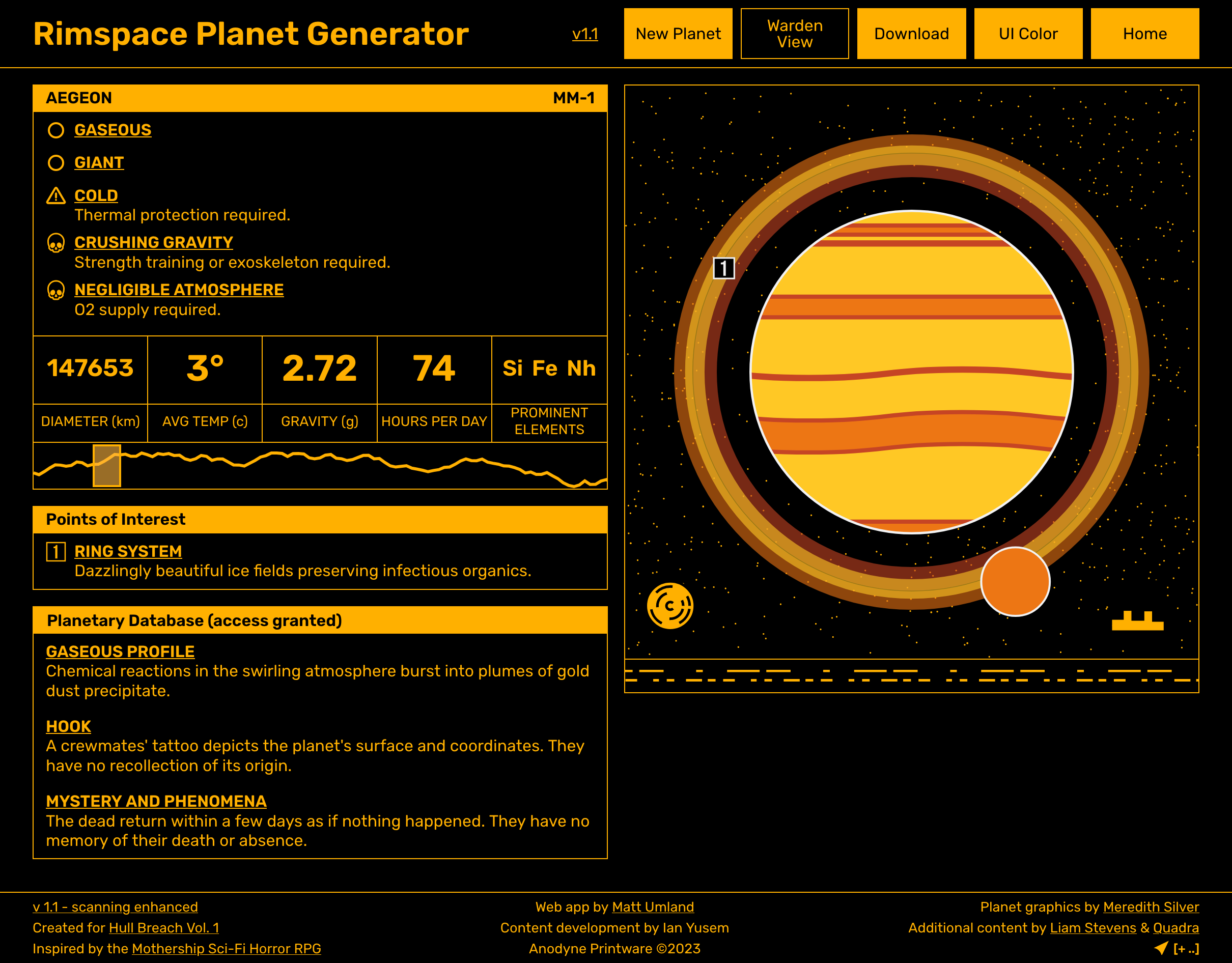Quadra wrote dozens of entries for Anodyne Printware’s Rimspace Planet Generator, a free, ENNIE-winning, system-neutral tool for generating interesting planets with strange things on them for your tabletop RPGs.
