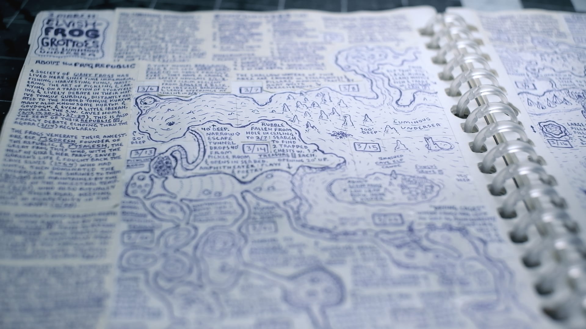 It's a theme I started to notice around the time I was first drawing the third level, the Elvish-Frog Grottoes (& the Luminous Undersea). The first level, the Ancient Baths, has water running through it of course, but I think it was really the Grottoes that cemented water & wetness as major themes I would carry not just throughout the dungeon, but also into the overworld above.